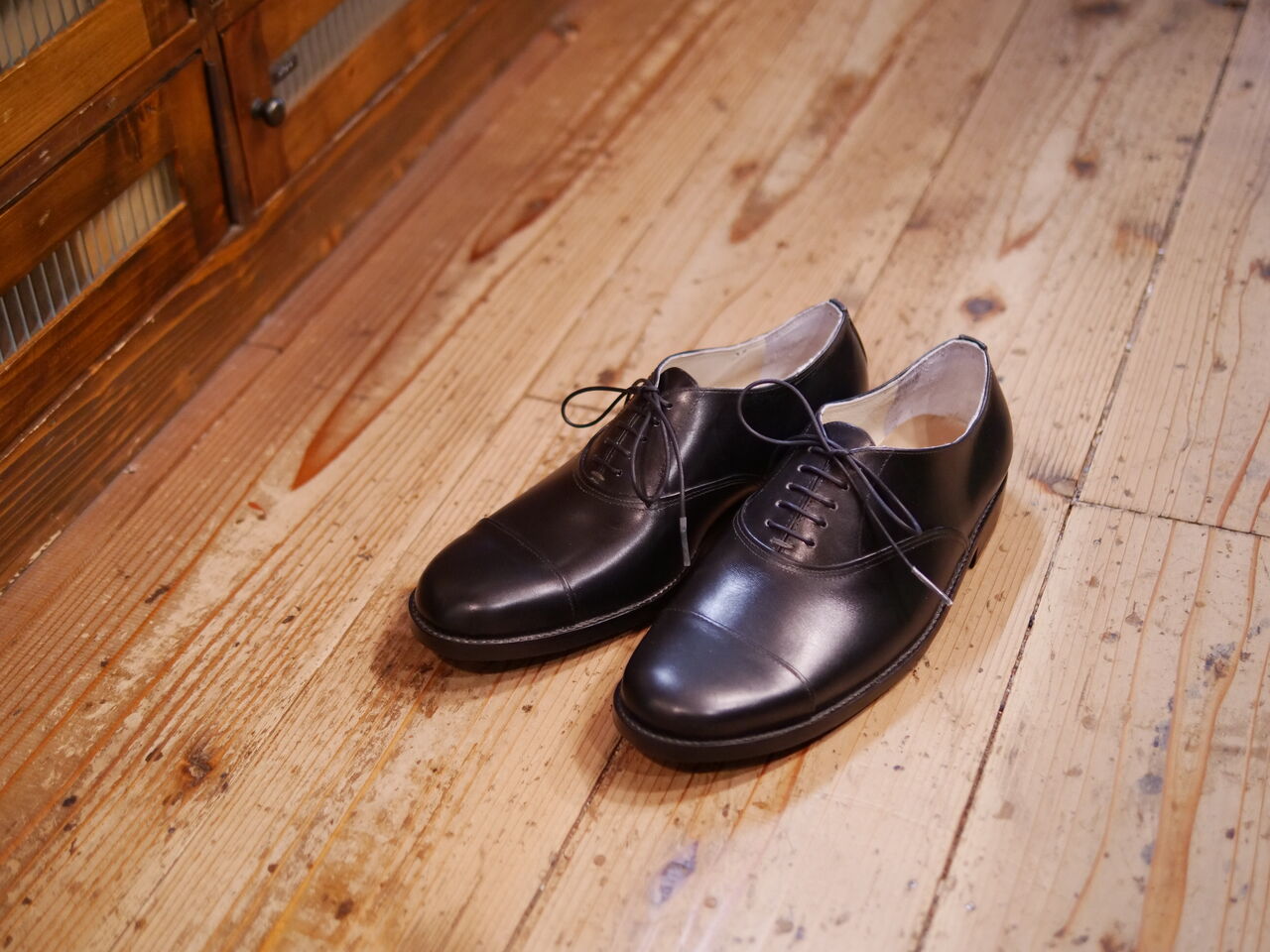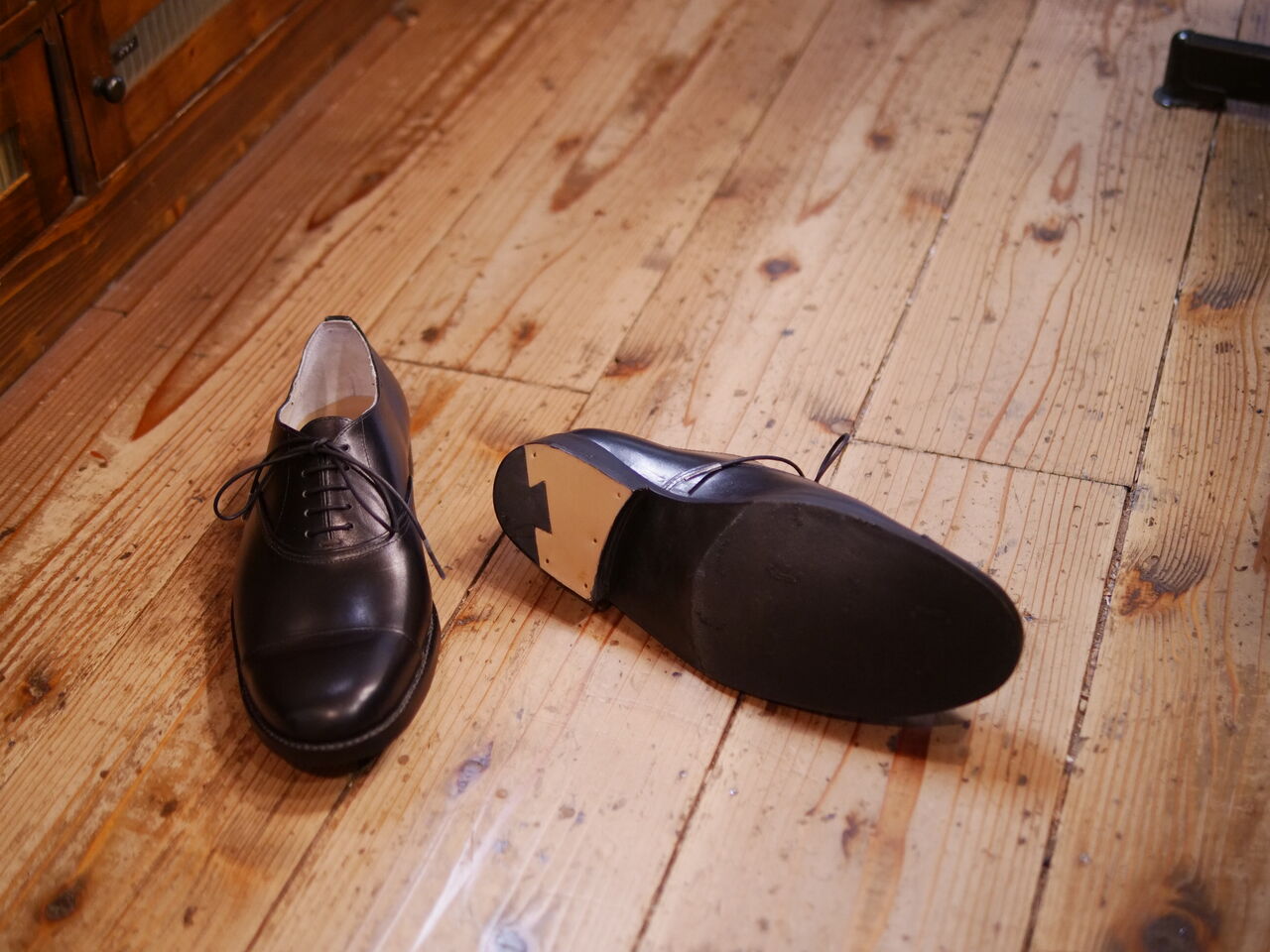 2025年12月21日 ストレートチップの内羽根、完成! Mさんの新作、ご家族のために作ったストレートチップの完成です。フォーマルのド真ん中をいくデザインを、高級革「ボックスカーフ」で製作。この革は、とにかくキメが細かい。高密度に詰まっている感じ。ゆえに表面は傷が付きにくいほど硬く、抜群の光沢を誇りますが、これを木型につり込むとなると、その硬さが一気に難易度を跳ね上げもするという代物です。何度もやり直したつり込みの苦闘の証は、外から見ることはできなくても、靴底で閉じられた中にしっかり残ってます。 タグ :#生徒作品#内羽根#ストレートチップ