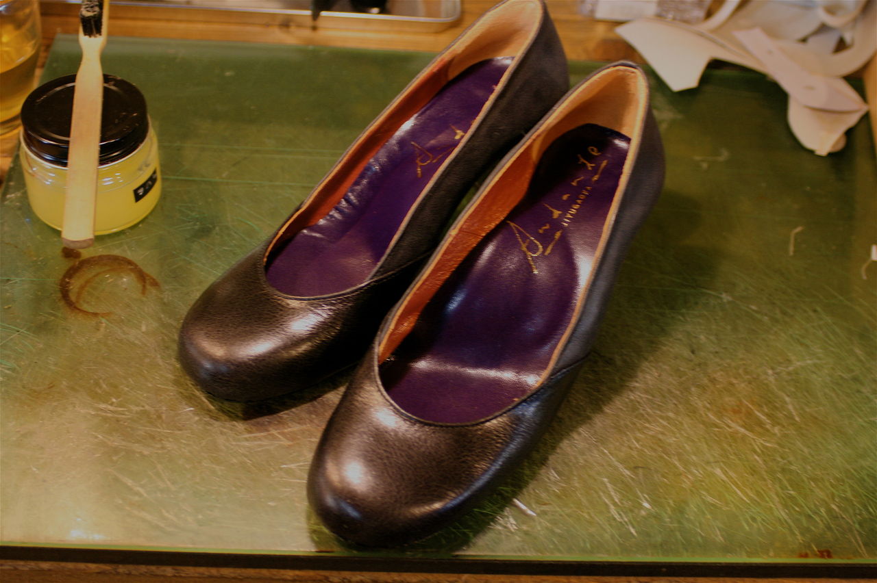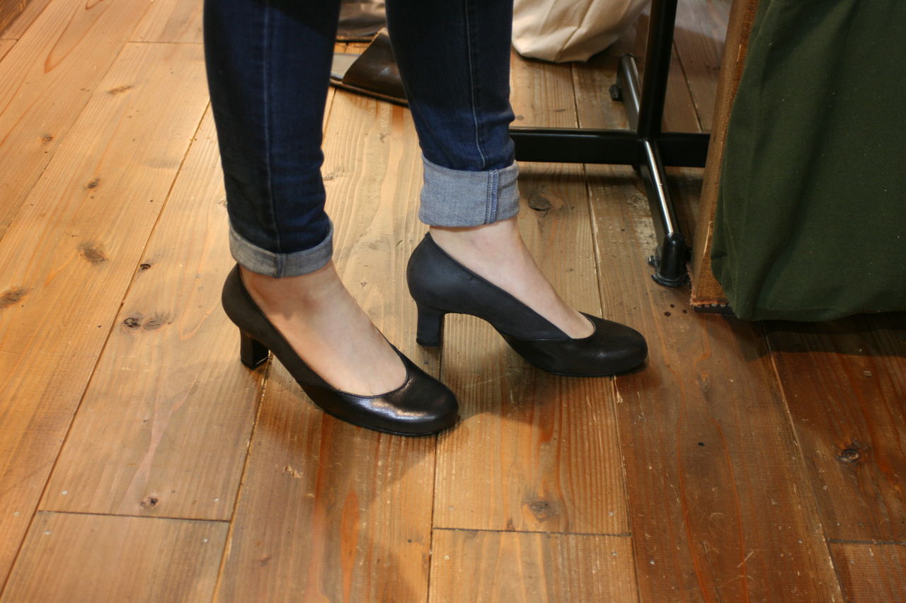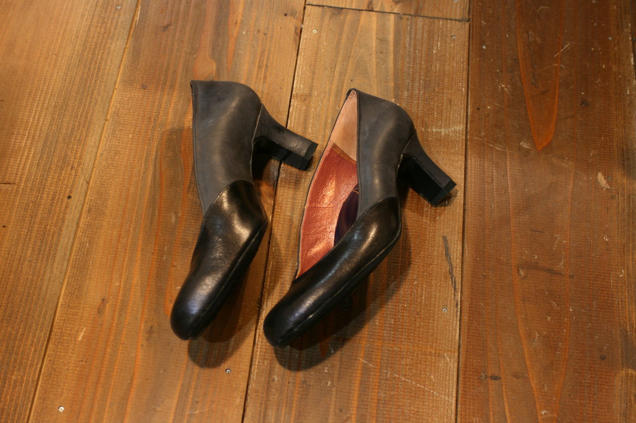 2015年01月20日 つやありの黒×つやけしの黒。パンプス完成! Kさんの自分用パンプス2足目。ヒールの高さは6センチ。同じ黒でも全く雰囲気、色合いの異なる2種類の革を組み合わせてのデザインが渋いです。前回と同じ木型を微調整しての今作、フィッティングもピッタリです。Kさんは親指の付け根から踵までの長さが長く、幅の細い足をしています。履き口のラインをぐっと浅く作っても指の股が見えませんので、履き口の開口が長くとれ、履いた時とてもスマートな印象に仕上がりました。 タグ :#生徒作品#6センチヒール#パンプス#靴教室#アンダンテ靴工房