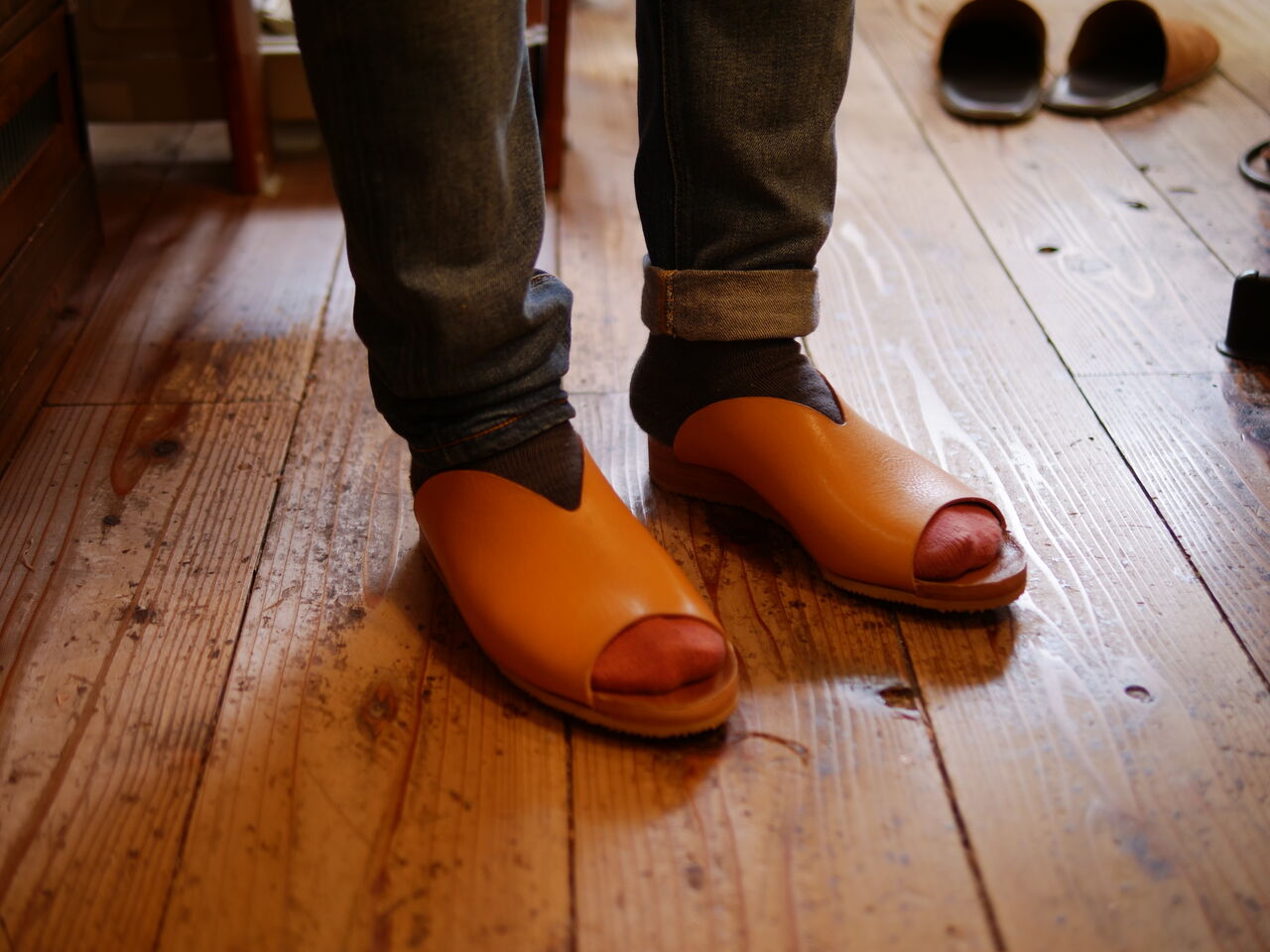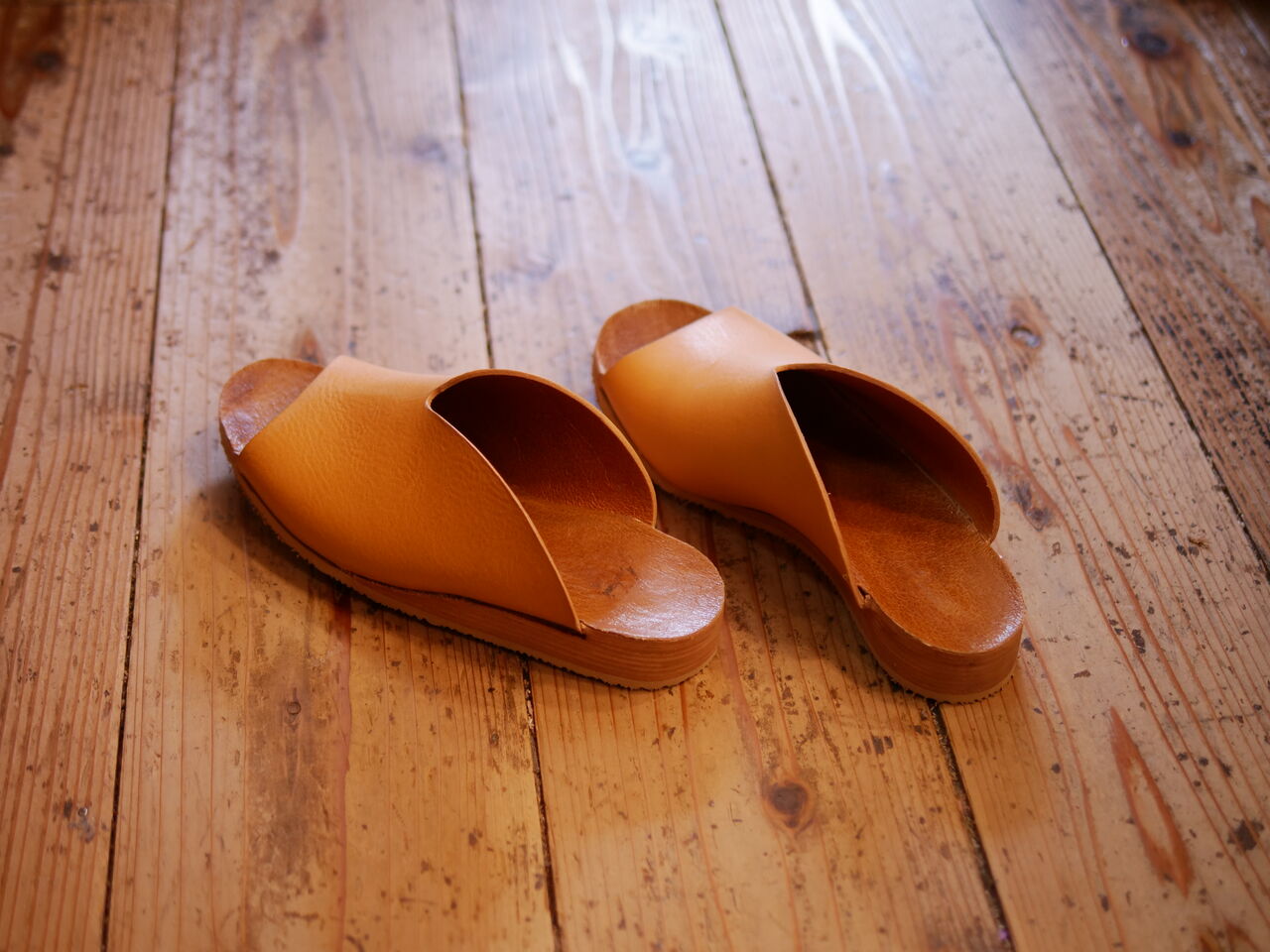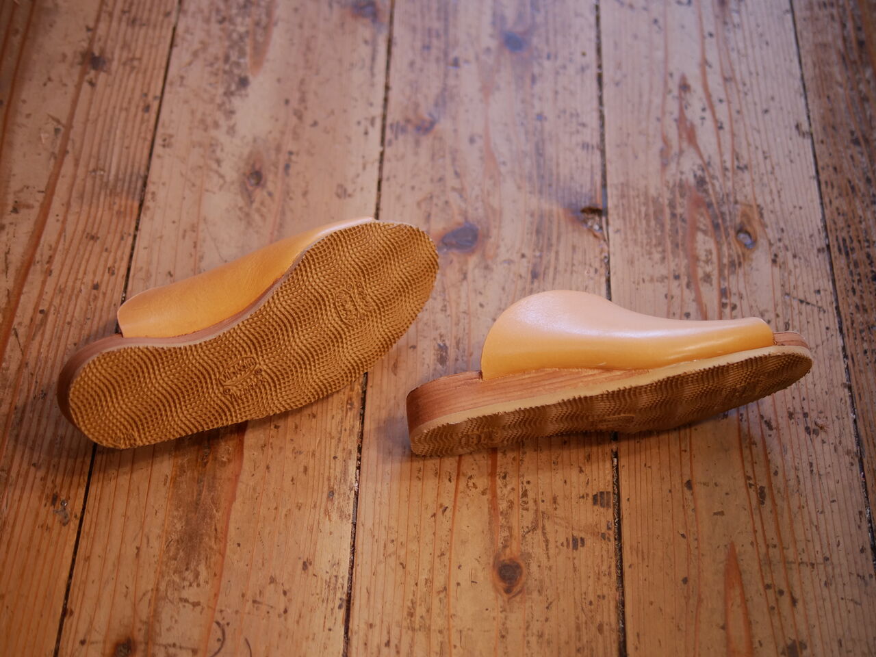 2025年07月16日 サンダル、完成! Kさんの新作、シンプルなサンダルの完成です。アッパーは、分厚いヌメ革の1パーツかつ1枚構造の、切った革をつり込むだけのシンプルな作り。ソールは、革を積み上げて作るウエッジソールで、見た目はシンプルながら難易度は高めの作り。よく見たら、一番底のEVA以外は全てヌメ革という、経年変化特化型の靴が完成していました。 タグ :#生徒作品#サンダル#ヌメ革