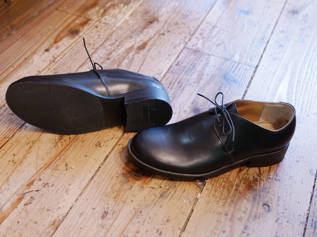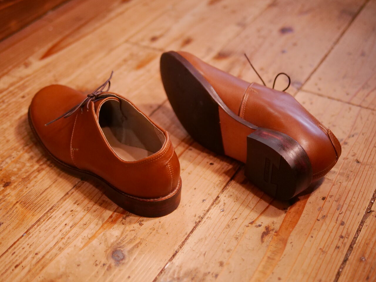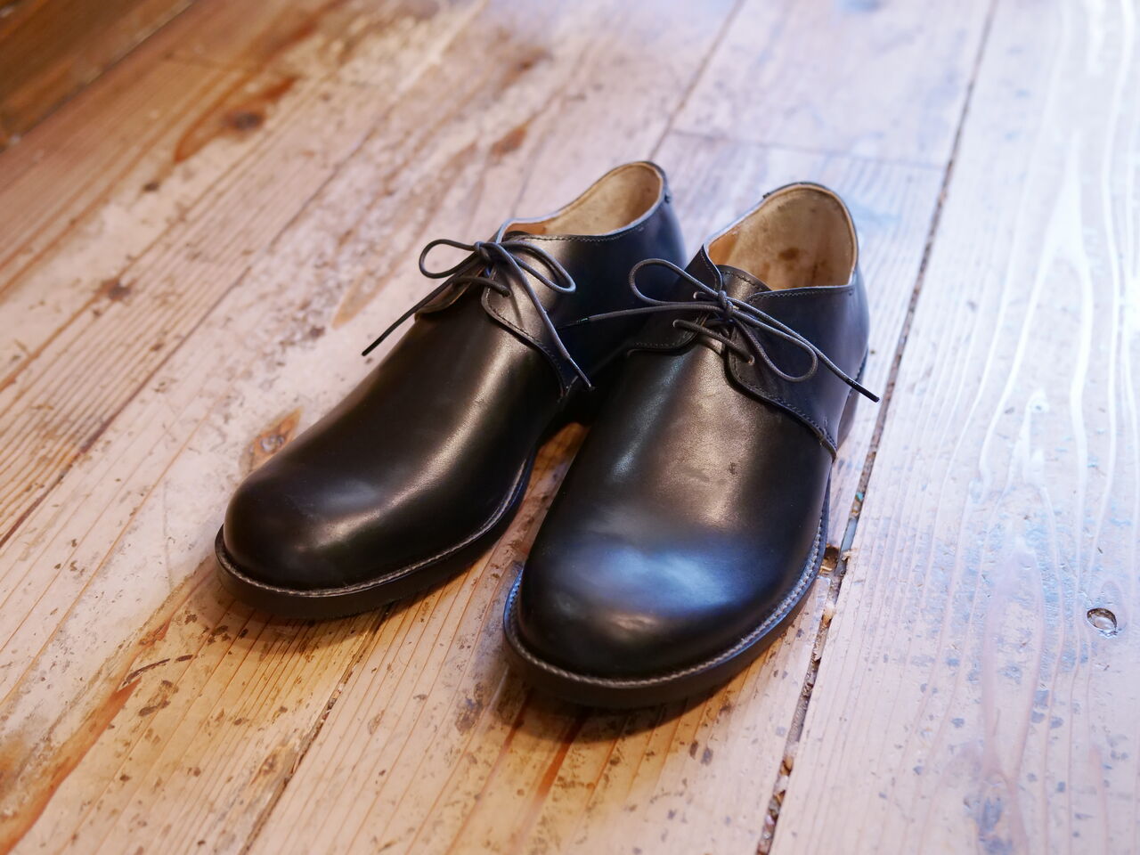 2025年07月16日 黒い2ホールの外羽根、完成! Mさんの新作、知人のために作った、紐を通す穴が2つの外羽根が完成しました。こういった羽根の面積が小さいデザインの靴はすっきり見えて非常に洗練された感じがしますが、ホールド力を羽根で調整できる範囲が少ない分、木型でしっかり合わせておかないと緩い靴になりがちです。また、羽根の付け根の位置をあまり狭く設定すると足が入らないなんてことにもなるので、注意が必要です。アッパーに使用している革はボックスカーフと呼ばれるキメの細かい硬めの革。つり込みの難易度はそこそこ高いですが、綺麗につり込むと磨き甲斐のある靴に仕上がります。 タグ :#生徒作品#2ホール#外羽根
