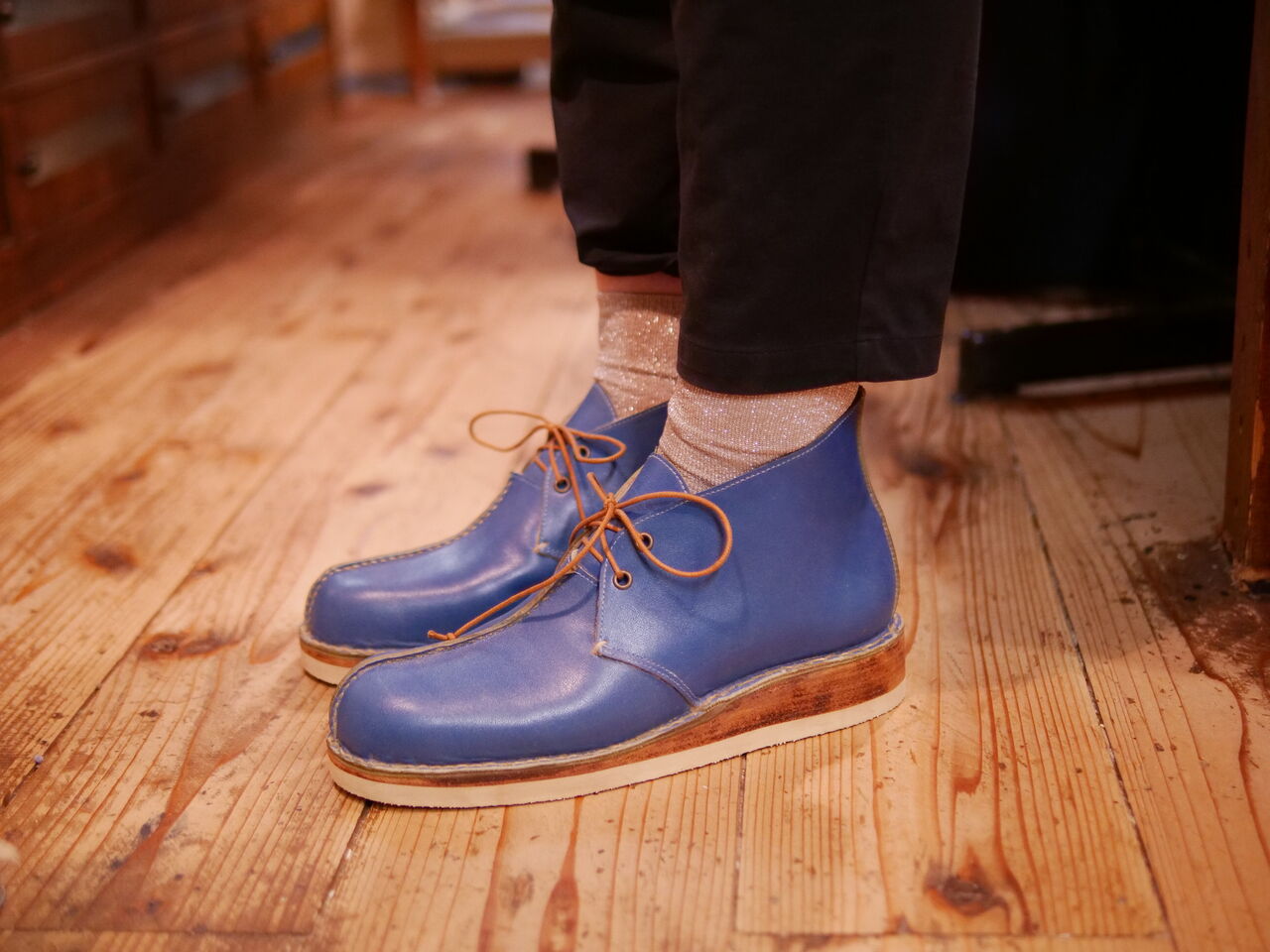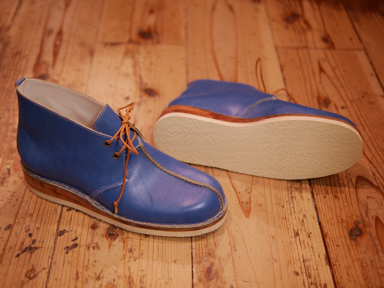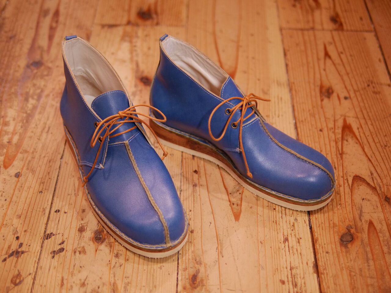 2025年07月16日 青いチャッカーブーツ、完成! Fさんの新作、独特の青さが印象的でありながら、どこか素朴な感じもする何ともいえない雰囲気を醸し出しているチャッカブーツの完成です。つま先から甲へ伸びるセンターシームは手縫いによるもの。それに加えて、ステッチダウン製法による底付けと革を積み上げたウエッジソールでカジュアルながら重厚な仕上がりに。 タグ :#生徒作品#チャッカブーツ